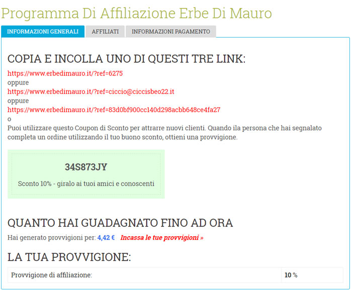 Si l'utilisateur arrive sur ErbediMauro.it, après avoir cliqué sur l'un de vos liens de connexion et a terminé une commande, ou s'il termine la commande en utilisant votre bon de réduction, vous avez droit à une commission égale à 10% de la vente .