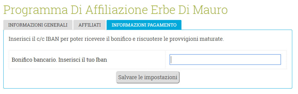 - saisissez l'IBAN de votre compte courant : pour cela rendez-vous dans « Votre compte > Programme de parrainage » et cliquez sur l'onglet « Informations de paiement ». Une fois cela fait, entrez le code IBAN de votre compte bancaire dans la case appropriée ( cliquez ici pour voir un exemple d'image). Cliquez enfin sur le bouton "Enregistrer les paramètres".
