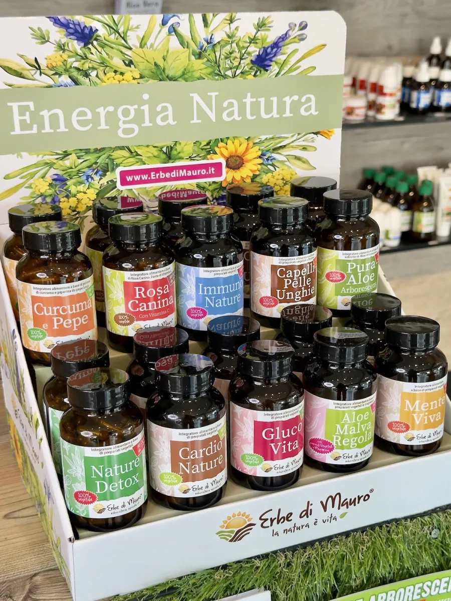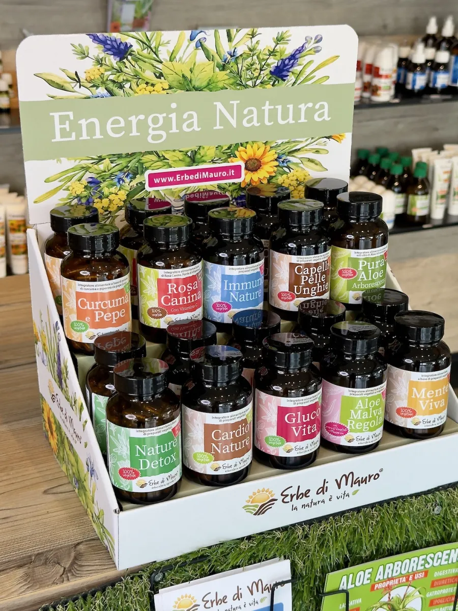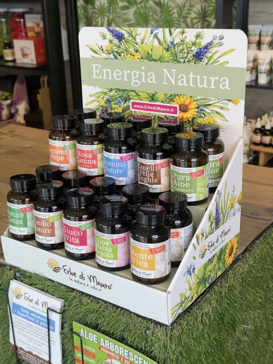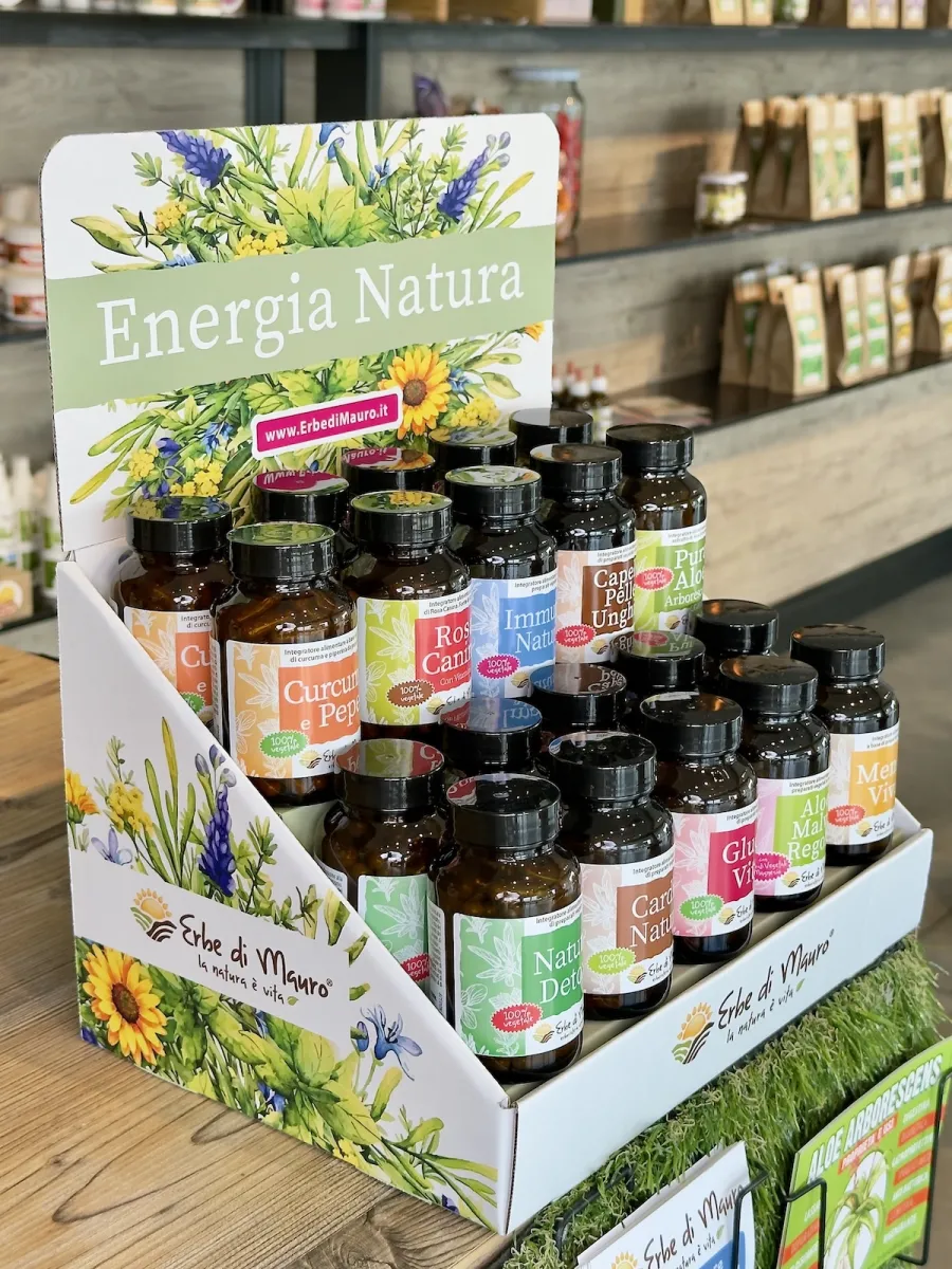 Valorizza la tua linea di integratori naturali Erbe di Mauro con questo espositore da banco: elegante, compatto e pensato per mettere in chiara evidenza i tuoi prodotti. Design essenziale e armonioso, perfetto per comunicare i valori Erbe di Mauro: cura, natura, semplicità.